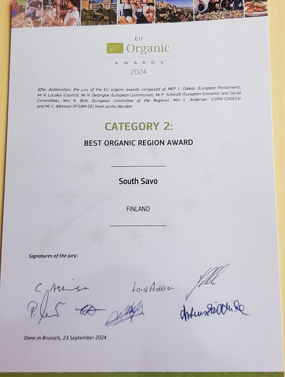 Etelä-Savo valittiin EU:n parhaaksi luomualueeksi 2024. Voittaja julkistettiin Brysselissä Unionin luomupäivänä 23.9.2024.