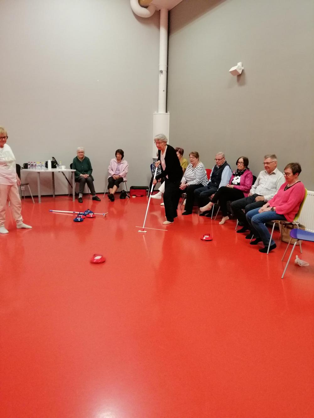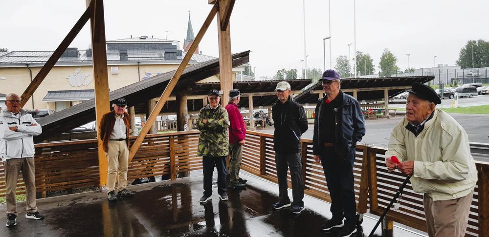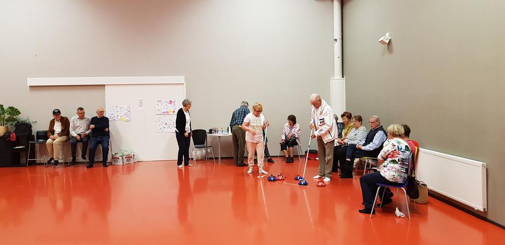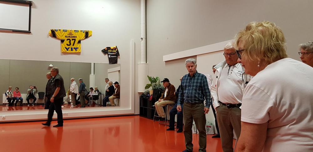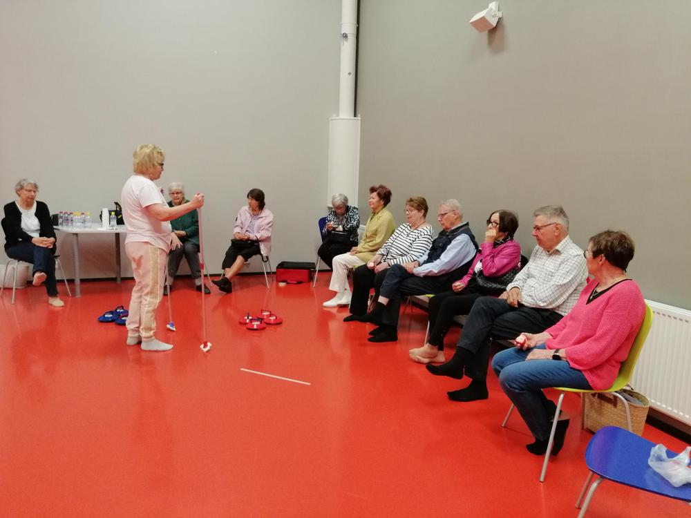 Kirkon esittelyn jälkeen päivän vietto jatkui Vesiliikuntakeskus Sampolassa ja viereisessä laavukylässä - curling-ryhmä kokoontui liikuntasalissa ja tikka-ryhmä laavukylän katetulla esiintymislavalla.