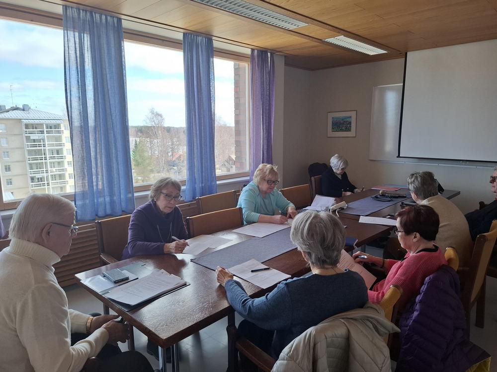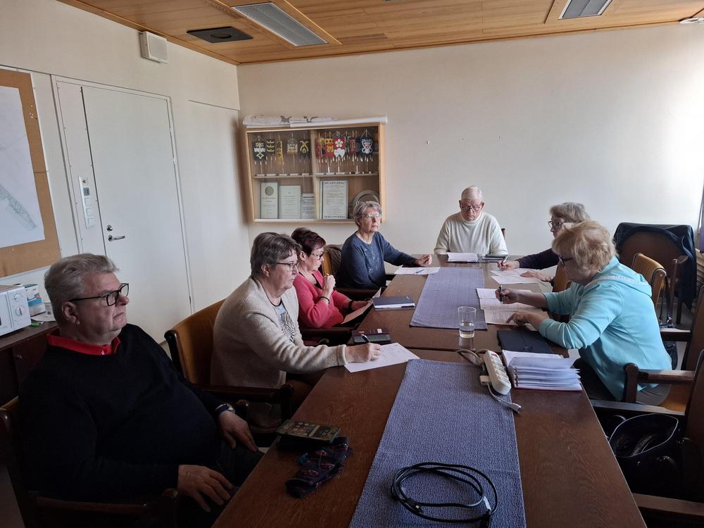 Hallituksen kokouksessa, jossa paikalla olivat kaikki jäsenet ja varajäsenet, valmisteltiin Juvan Kesämarkkinoihin liittyvät asiat. Senioriosastolla toimintaa esittelevät Airi, Pirjo, Raija, Esko ja Risto.