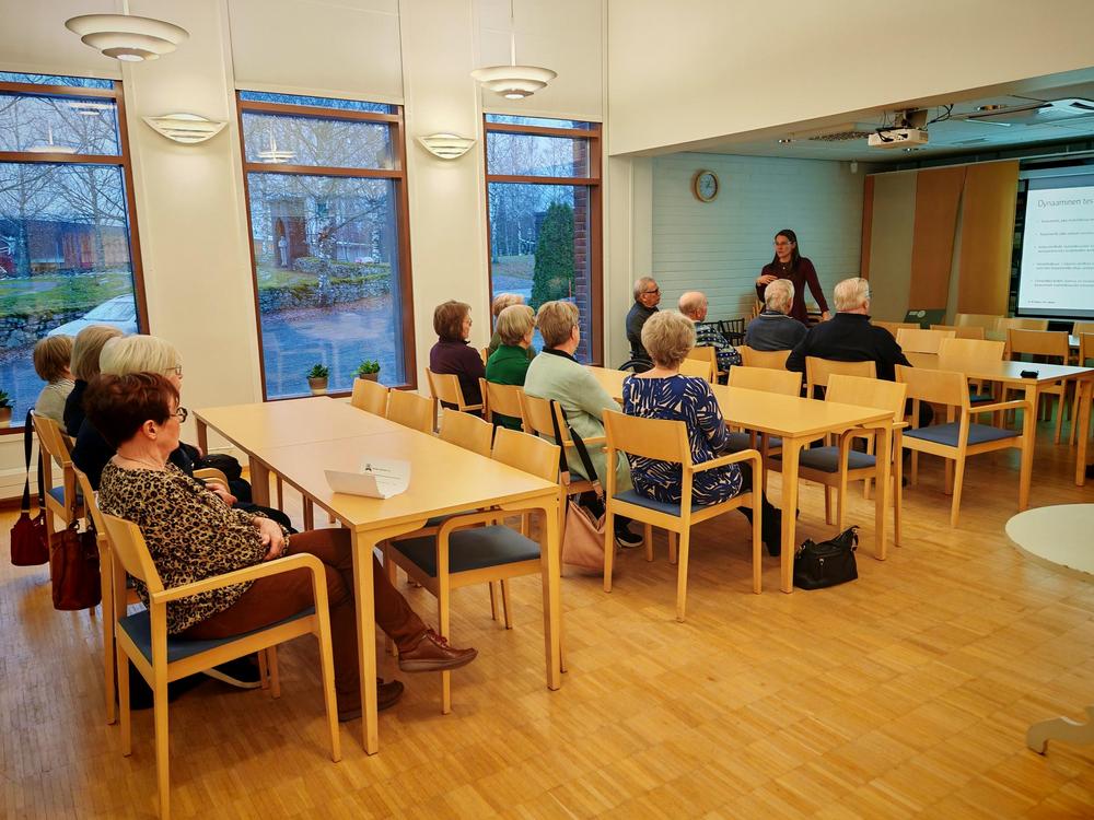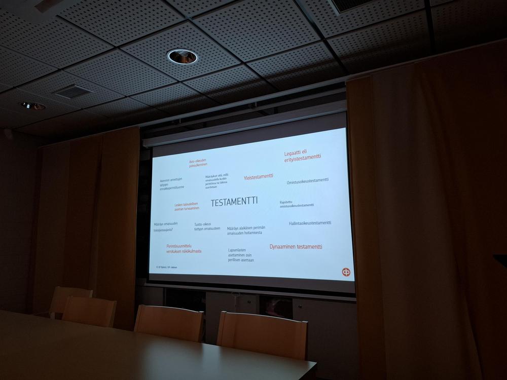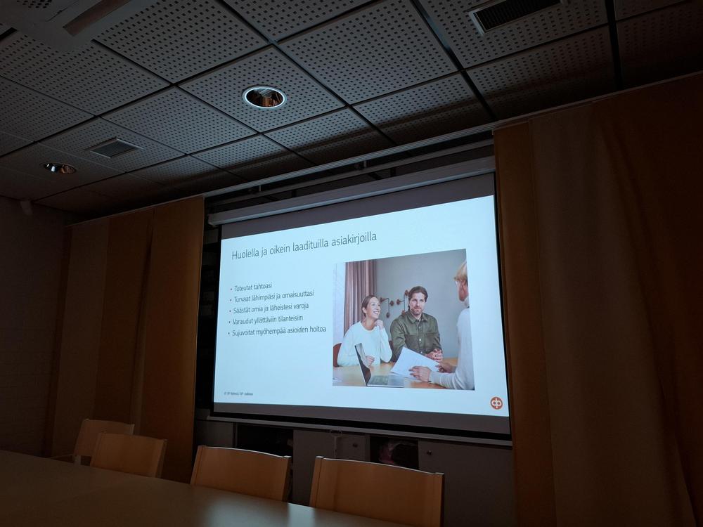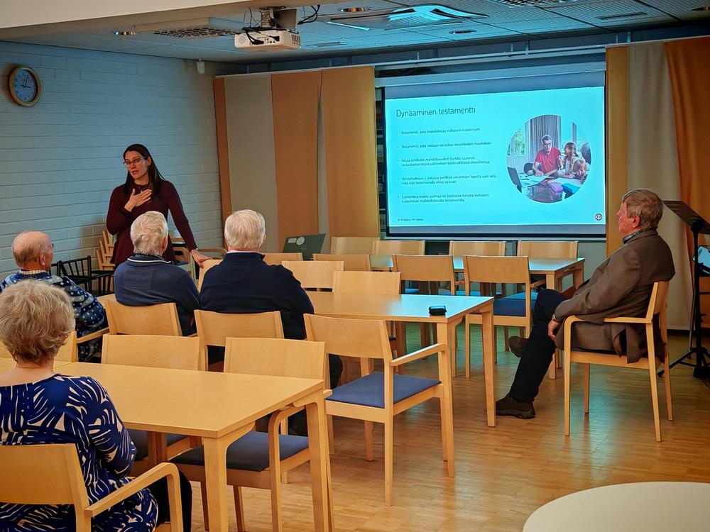 Vieraanamme oli lakipalvelujohtaja Minna Simpanen Suur-Savon Osuuspankista. Selkeäsanaisesti hän kertoi edunvalvontasopimuksen merkityksestä korostaen sen tekemistä riittävän aikaisessa vaiheessa. Esityksensä toisessa osassa hän esitteli testamentin laatimiseen liittyvää prosessia siihen liittyvien muotomääräysten kannalta. Lopuksi hän suositteli turvautumista edellä mainittujen asiakirjojen laadinnassa asiantuntijoiden apuun. Näin ehkä vältyttäisiin jälkikäteen ilmeneviltä yllätyksiltä.