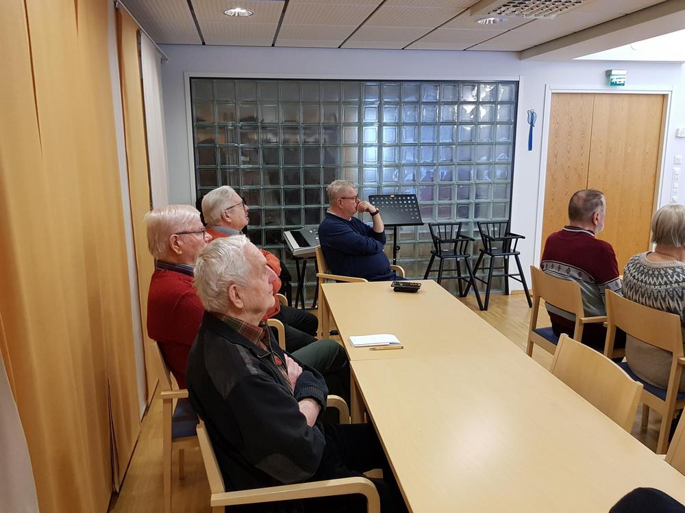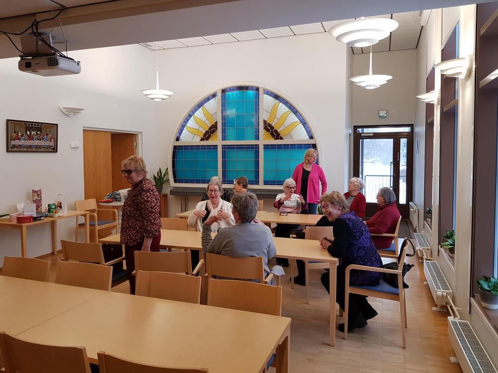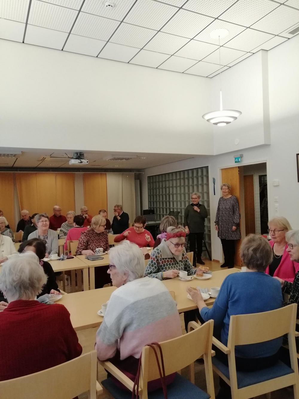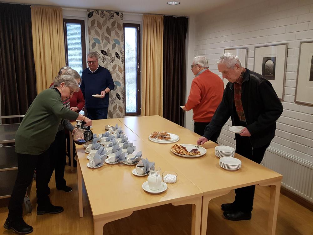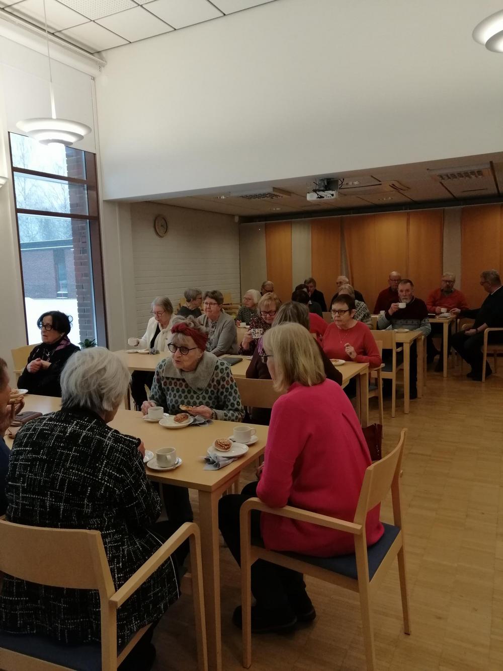 Toimintavuoden ensimmäisen kuukausitapaamiseen oli saapunut kolmisenkymmentä senioria teiden liukkautta uhmaten. Kahvitarjoiluvuorossa oli Kaija Horttana - pöydässä oli suolaista ja makeaa suuhun pantavaa.