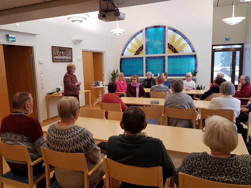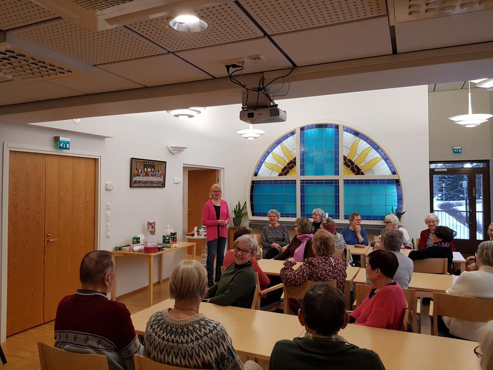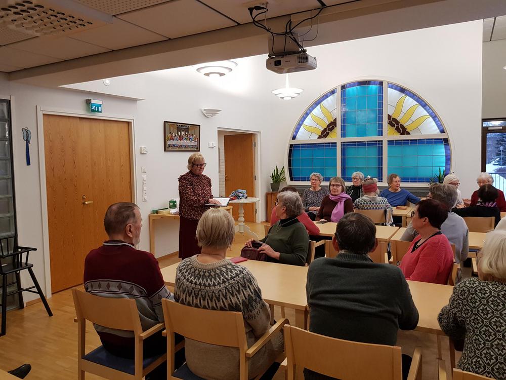 Seniorit keskittyneet kuuntelemaan esitystä ja puheenjohtaja Eijan ajankohtaiskatsausta.
