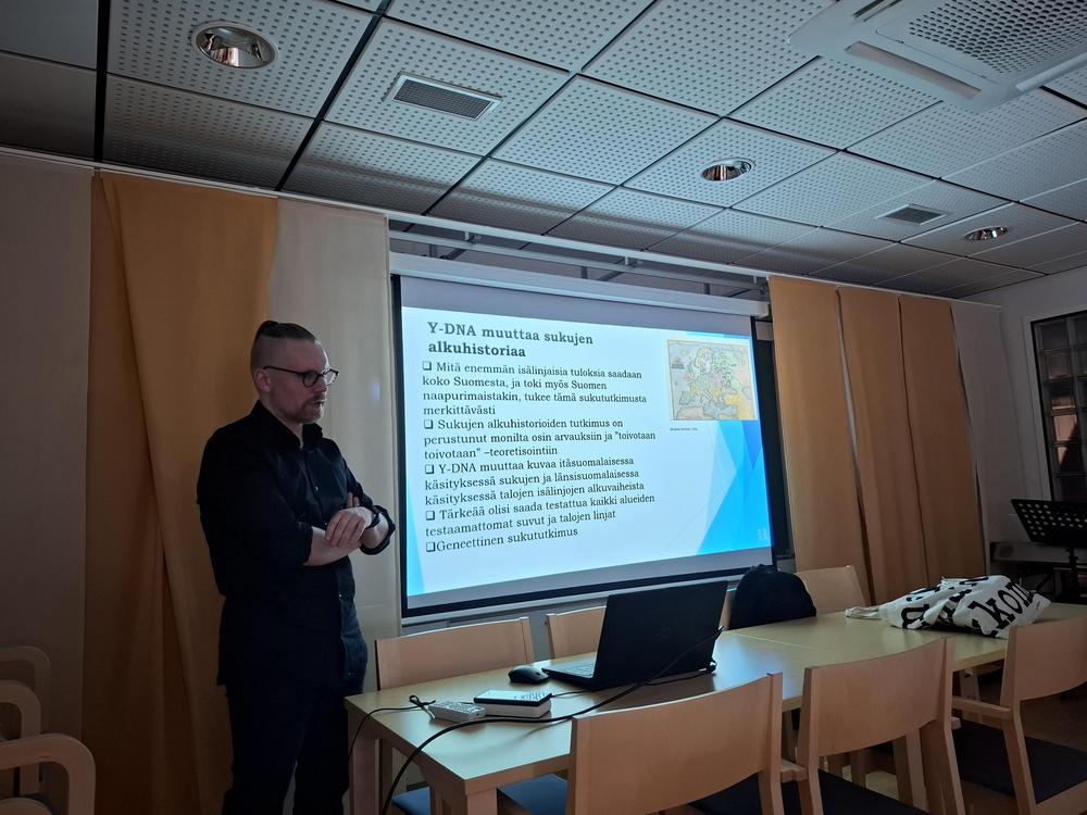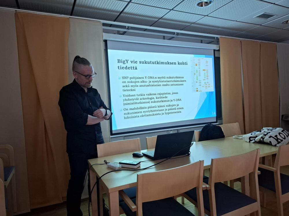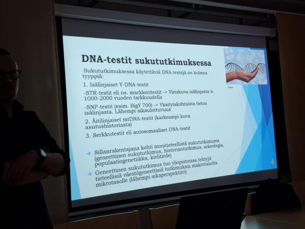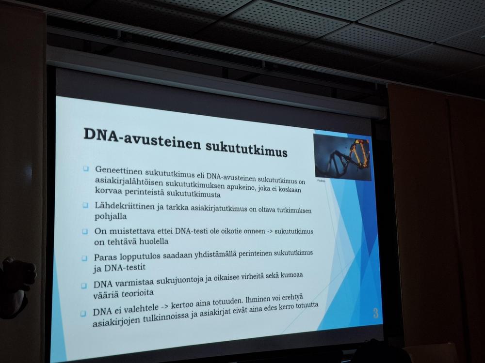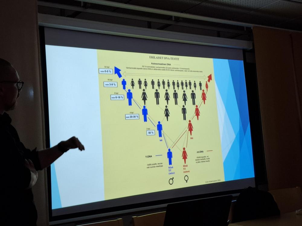 Vieraaksi olimme saaneet juvalaisen, väitöskirjatyötään valmistelevan Ari Kolehmaisen Suku- ja historiapalvelu Menneen Jäljistä. Mielenkiinnolla seurasimme hänen esitystään "Geneettisen sukututkimuksen mahdollisuudet".