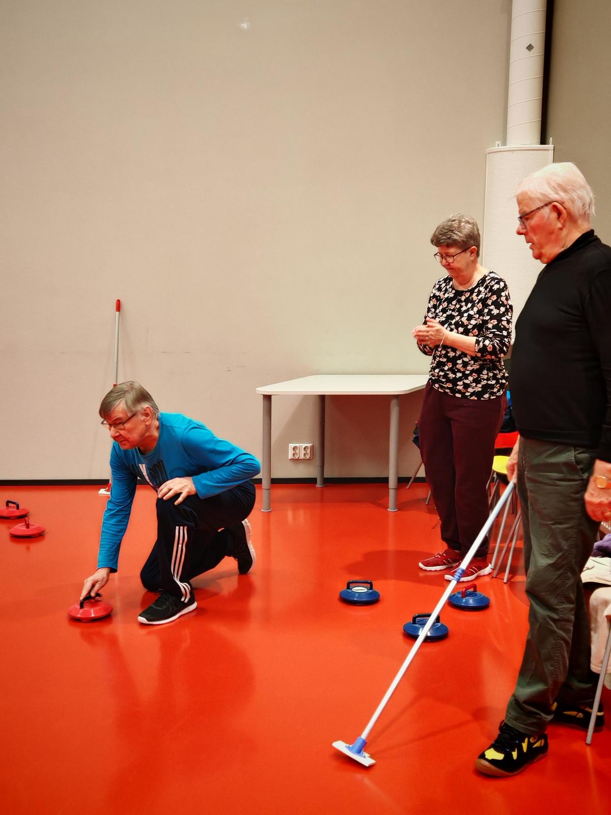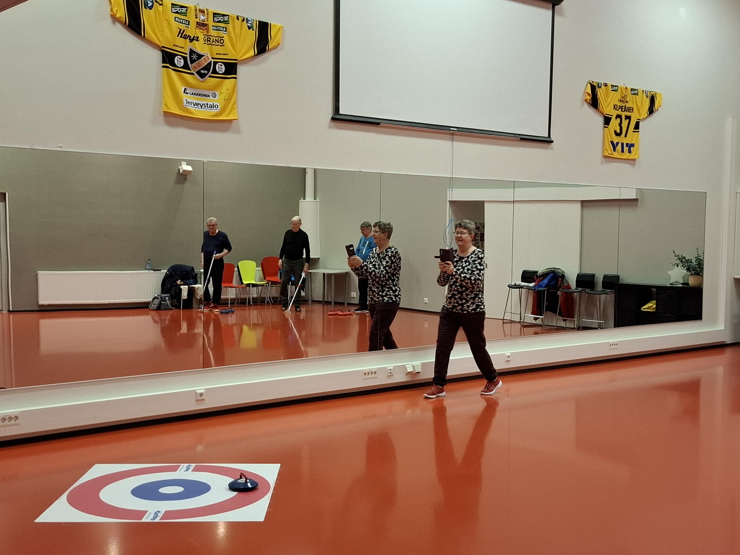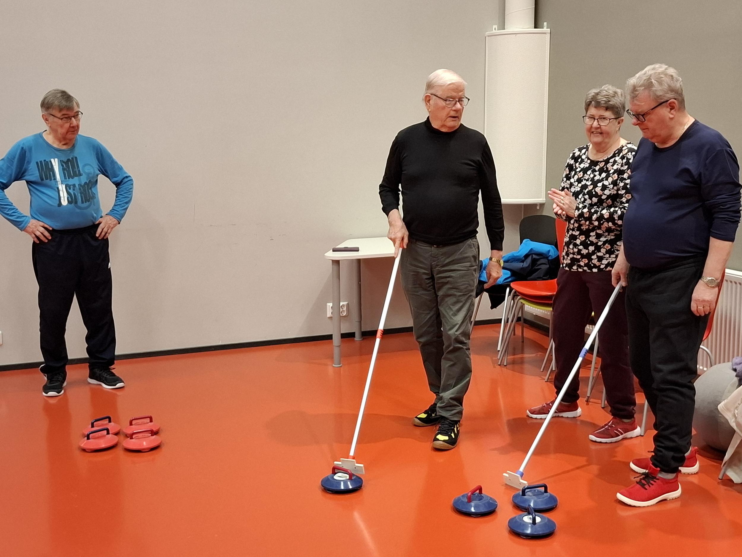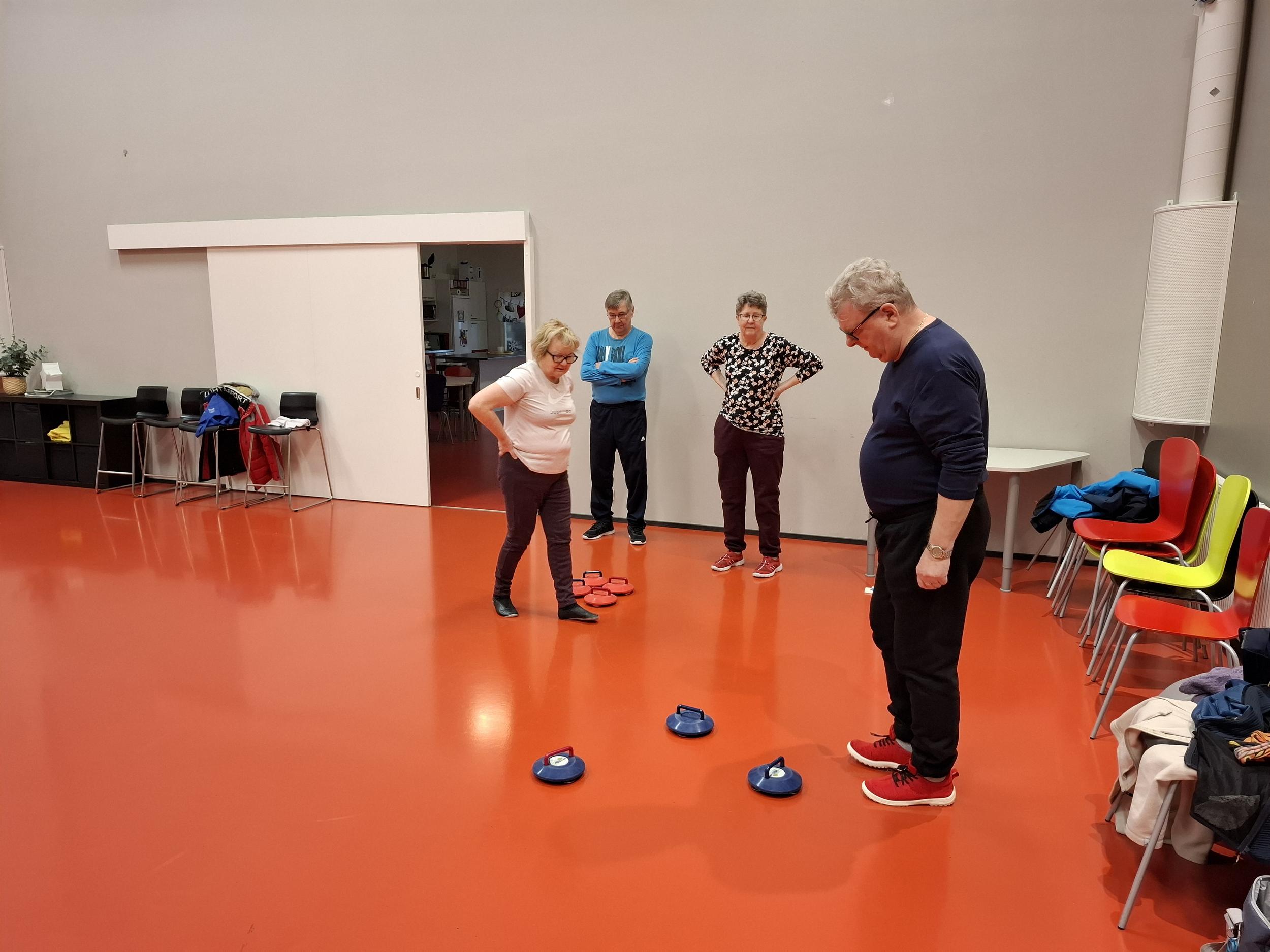 Aila, Jarkka ja Risto pelasivat sinisillä ja Eija, Reino ja Esko punaisilla. Kuvat puhukoot! Tärkeintä oli mukava yhdessäolo uuden harrastuksen parissa.