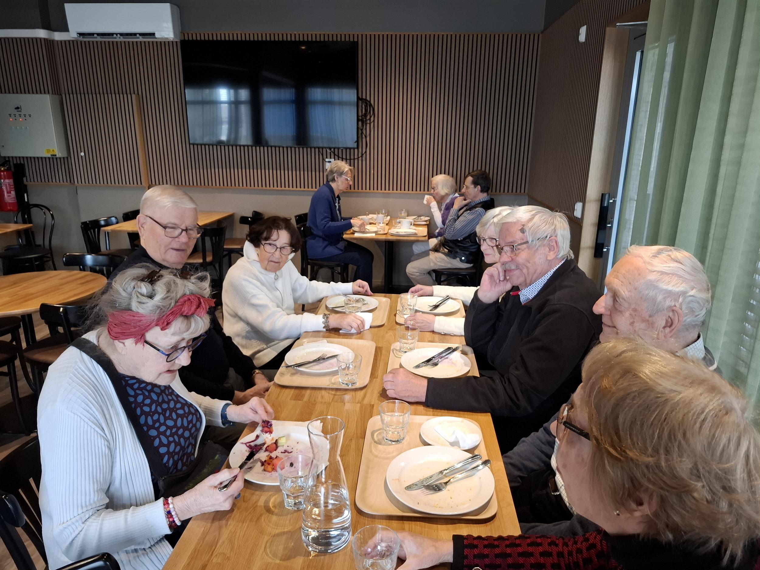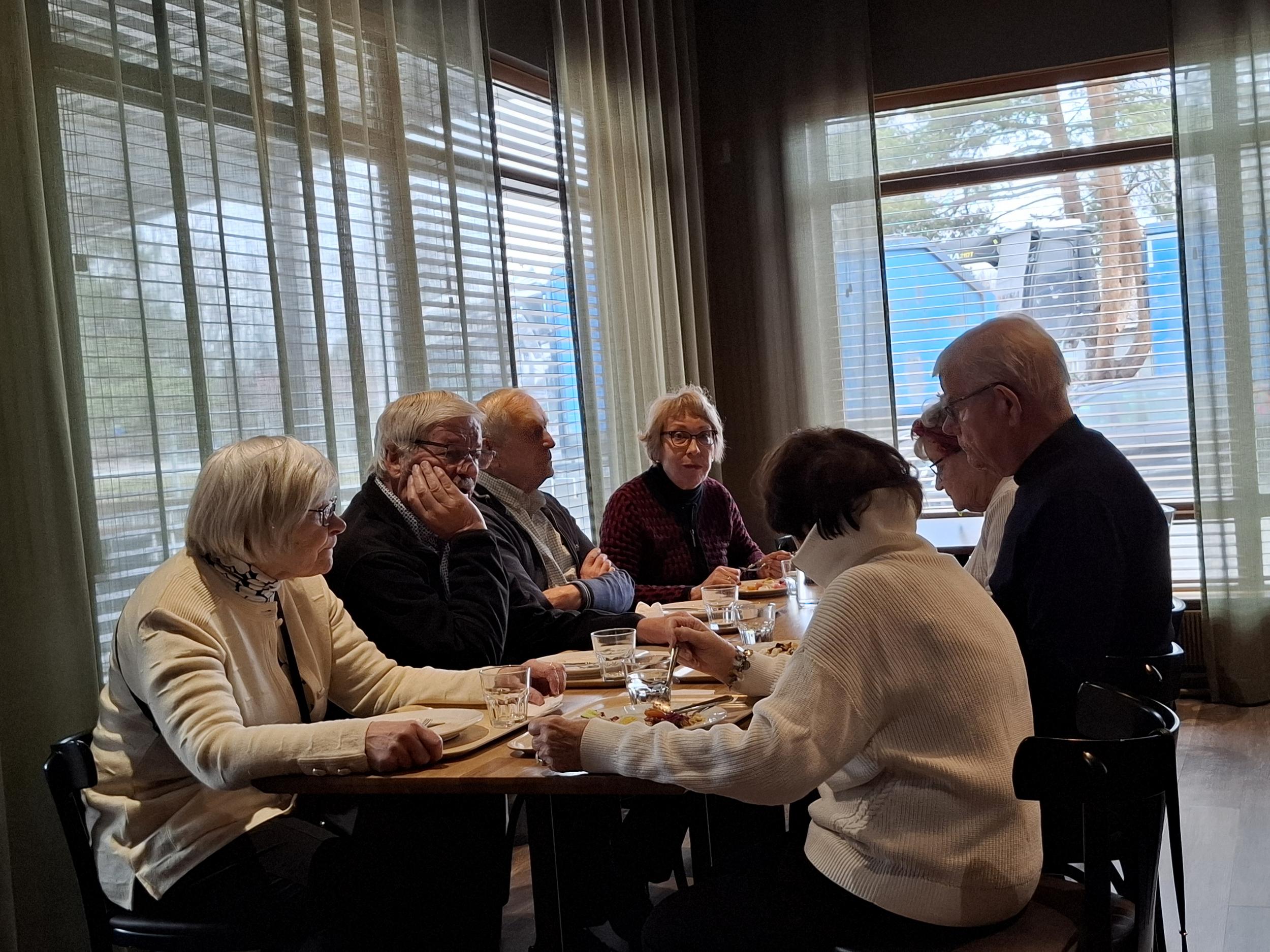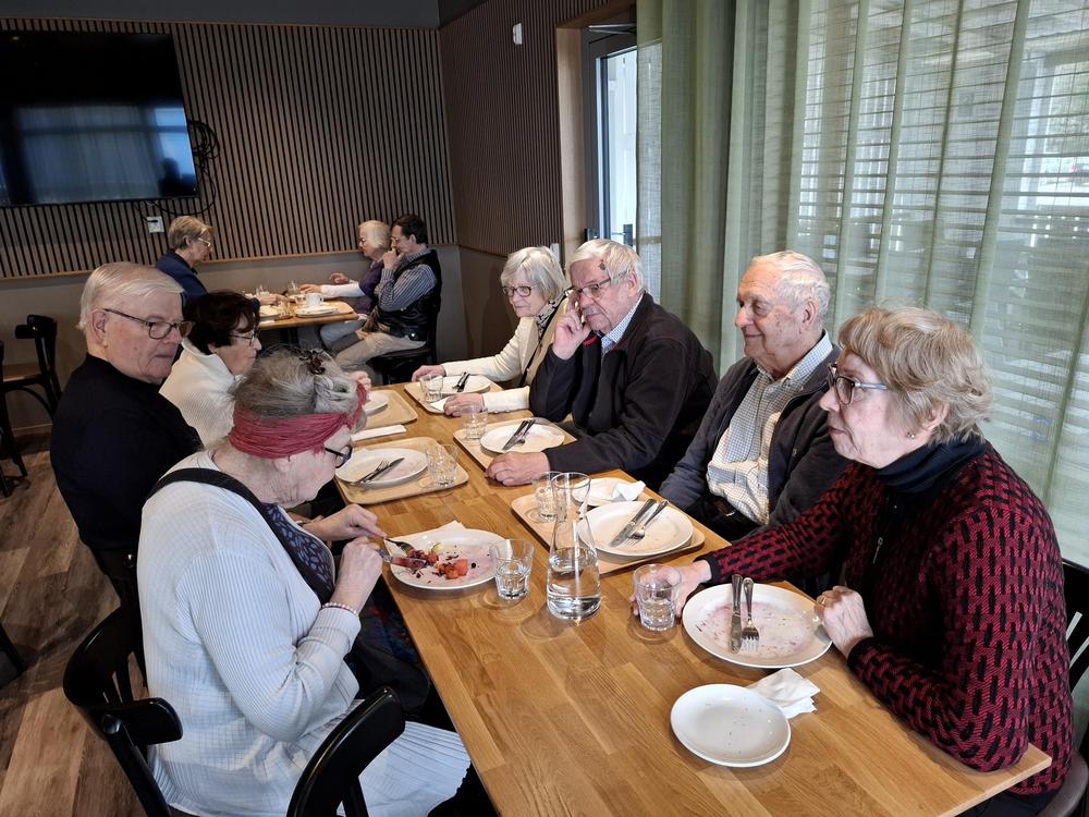 Idän Portin Helmen noutopöydässä oli tarjolla erilaisia salaatteja ja savulohilaatikkoa. Ruokailu sujui pöydissä tarinoidessa ja kuulumisia vaihdettaessa. Kuukausitapaaminen 29.4. oli puheenaiheena, koska Senioriliiton järjestöpäällikkö Pia Nyman tulee vieraaksemme. Myös piirin puheenjohtaja Erkki Valjakka on paikalla sekä edustajia myös muista yhdistyksistä.
