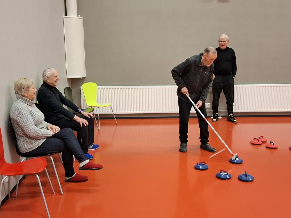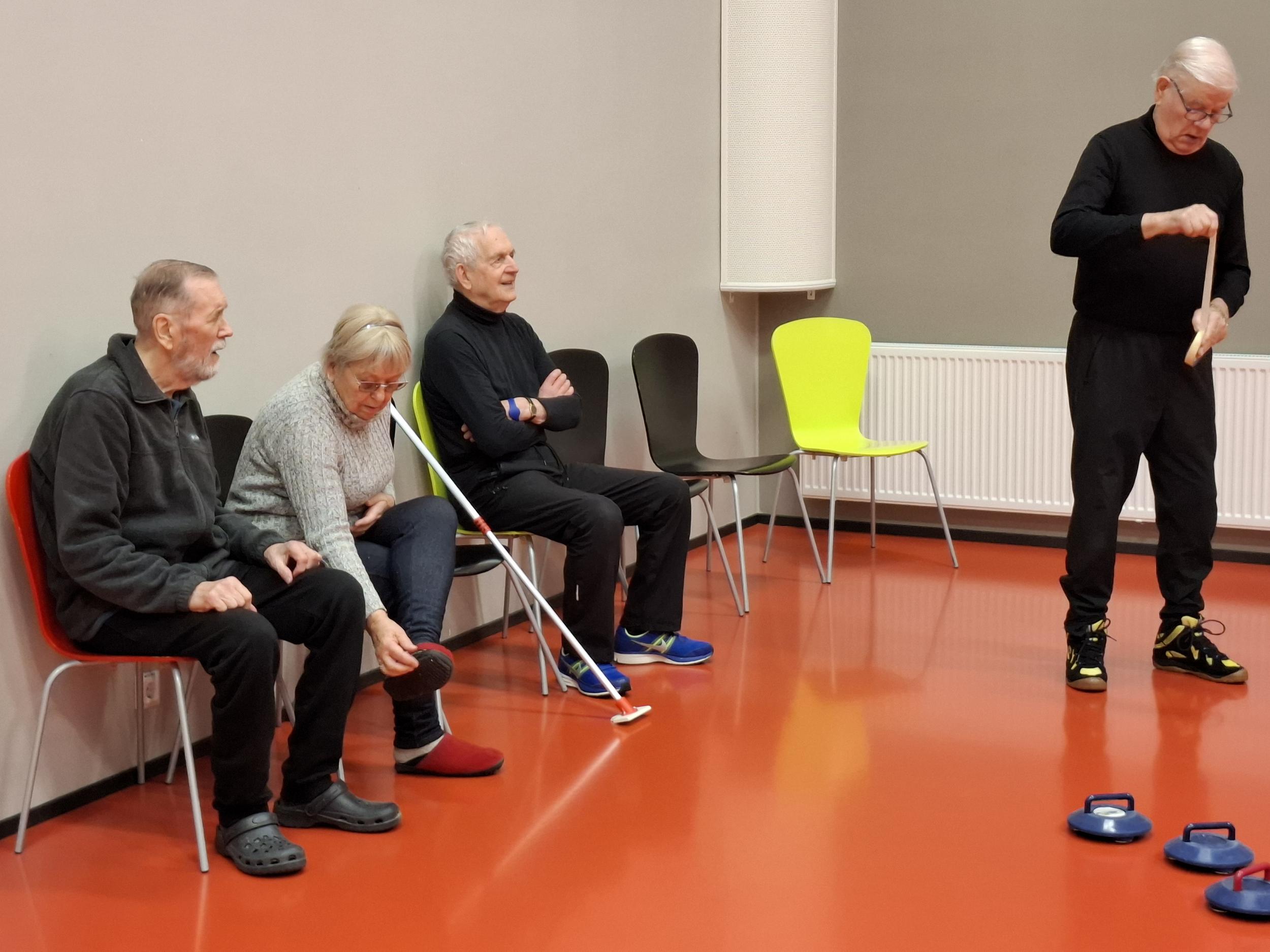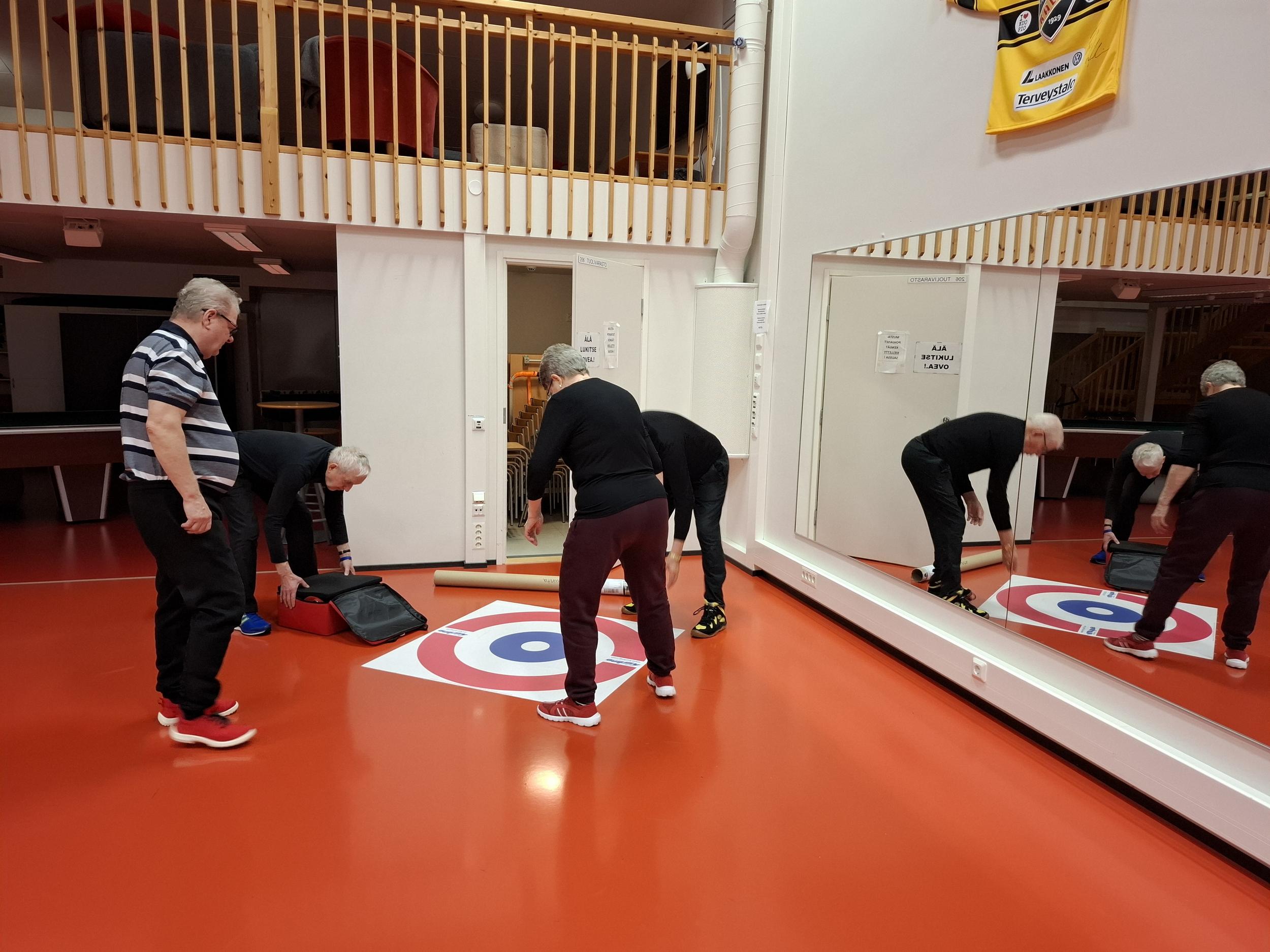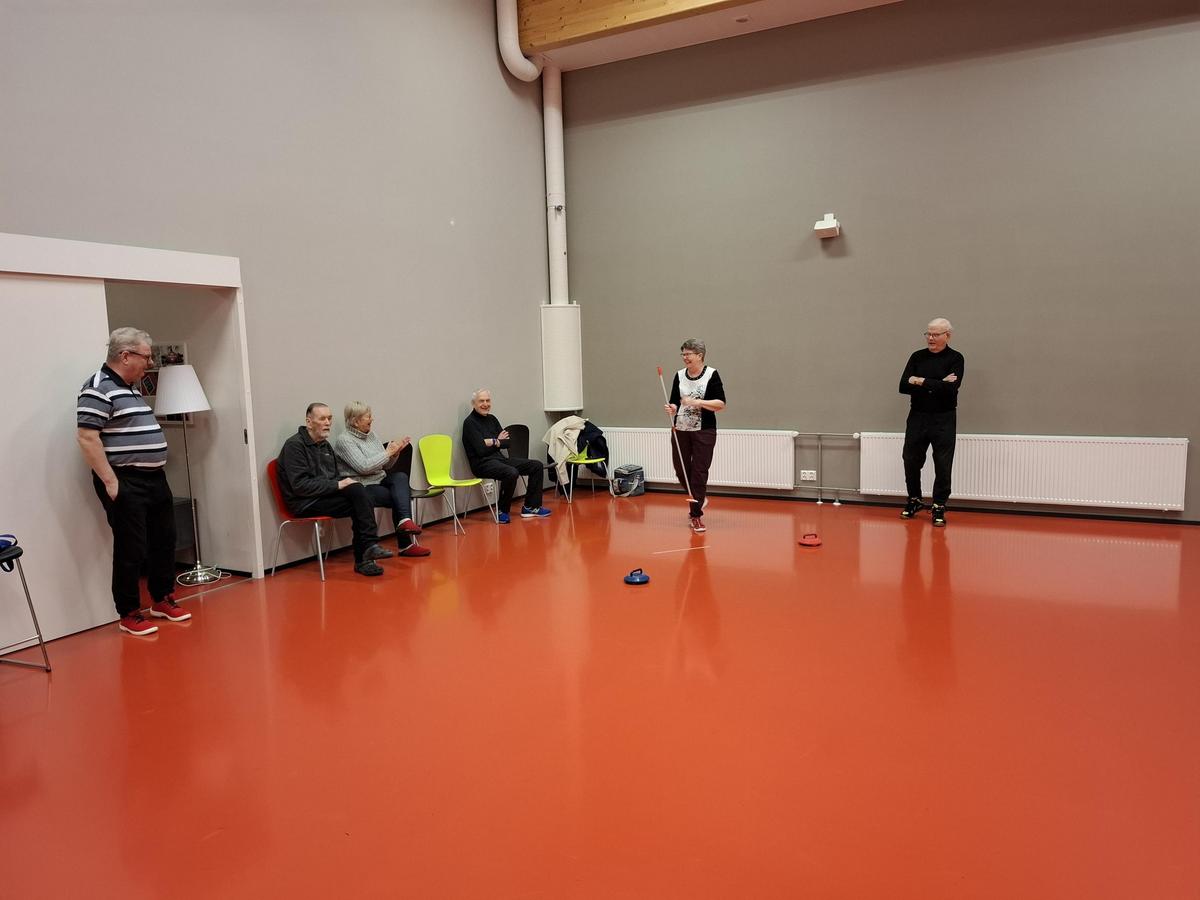 Olympialaisten jälkeisissä tunnelmissa Sampolan saliin oli kokoontunut 7 lajin paikallista harrastajaa: Aila, Marja, Topi, Risto, Erkki, Jarkka ja Esko. Pelaajien otteista näki heti, että lajia oli seurattu television kuvaruuduilta - tosin puuttuvat harjaukset eivät edistäneet "kivien" liukumista halutulla tavalla.
