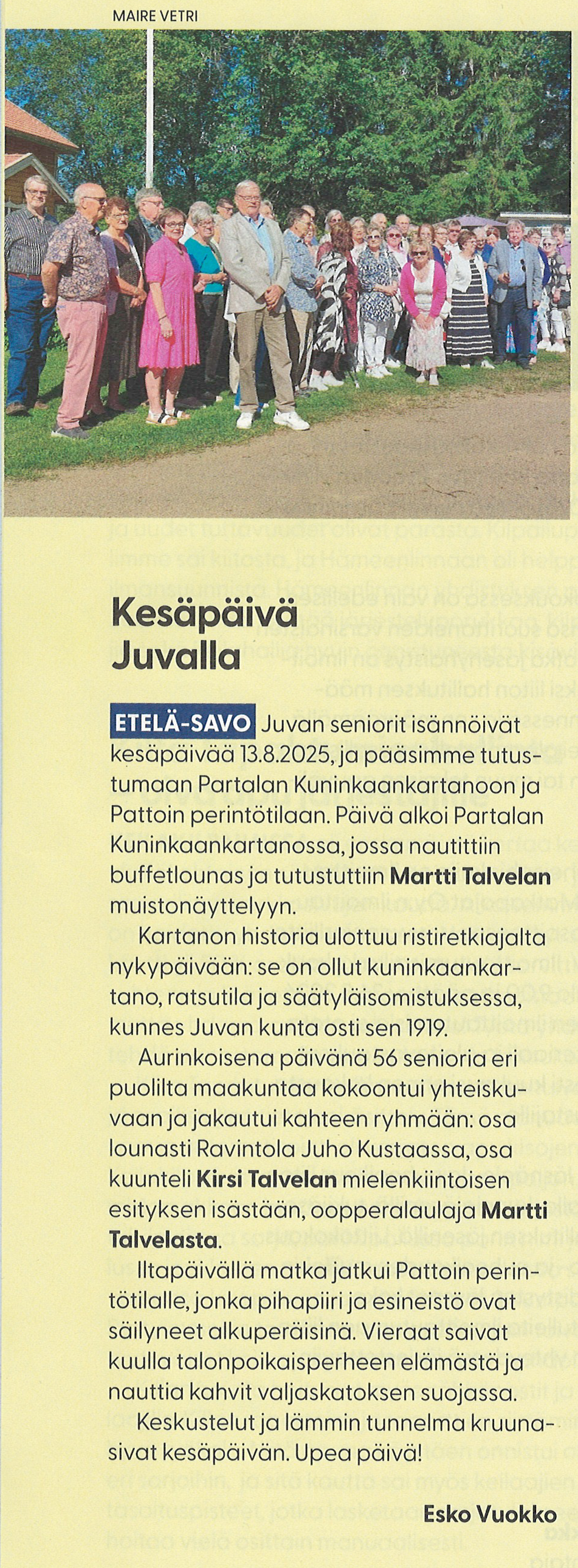 Etelä-Savon Senioripiirin kesäpäivän vietto kiinnosti myös jäsenlehteämme. Patinan numeron 5/2025 Paikallisyhdistysten toimintaa kertovassa juttusarjassa julkaistiin juttu "Kesäpäivä Juvalla". Siinä kerrottiin tuhannella merkillä ja yhdellä kuvalla kesäjuhlan tapahtumista.